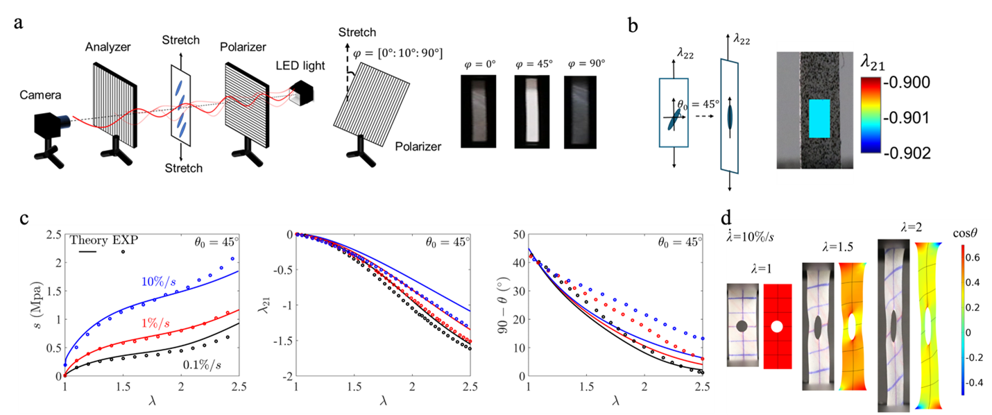 Figure 1(a)Schematics of the crossed-polarized optical measurement for directors, and the brightness changes of LCEs via rotating polarizers. (b) shear strain distribution using the DIC method. (c) Theoretical predictions for viscoelastic responses of LCEs under uniaxial tension compared with experimental results. Dependence of nominal stress, shear stretch and director rotation on external stretch under different stretching rates. (d) Experimental and numerical results of the deformation of a LCE with an off-center hole under various stretches. The color bar represents the director filed cosθ.