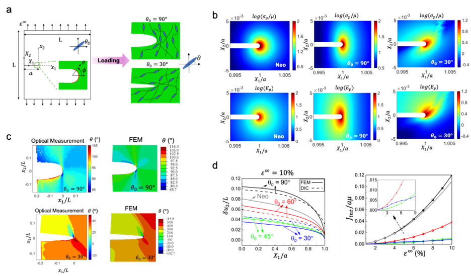 We first study the stress, strain and director fields at the crack tip of an edge-cracked LCEs film with various initial directors (Figure 3a). From FEA, we found distinct stress and strain distributions in LCEs compared to traditional neo-Hookean materials (Figure 3b). When the initial director is parallel to the stretching, the stress and strain are symmetrical about the crack plane but show elliptical shapes. Conversely, when the initial director is tilled to the stretching direction, the stress and strain distributions become asymmetrical about the crack plane. Notably, the stress and strain concentrations at the crack tip are not coincident in LCEs caused by spontaneous strain. Through examining the director distribution by both FEA and optical polarization (Figure 3c), we observed the director rotate in opposite direction at a critical polar angle ϕ. For parallel loading, the director near the crack tip rotates clockwise at ϕ<0° and counter-clockwise at ϕ>0°, inducing symmetric spontaneous strain. In contrast, for tilted loading, significant director rotation occurs near the crack tip and a domain wall is observed along a critical polar angle, where the director rotates clockwise in the region with a larger polar angle and counter-clockwise in the region with a smaller polar angle, leading to asymmetrical stress/strain distribution and elliptical stress/strain contour lines with the smoothest gradient direction close to the critical polar angle.