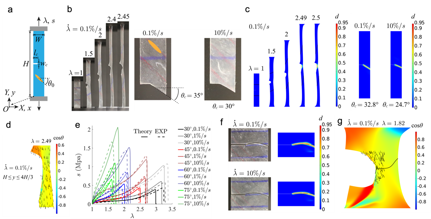 Figure 4 (a) Schematic of a LCE sample with a tilted initial director and a horizontal edged crack subjected to uniaxial tension. The initial director is illustrated by the orange ellipse. Images from (b) experiments and (c) simulations showing the deformation and crack propagation at different stretches, and the tilted fracture paths in the relaxed samples. The color bar represents the phase field d, and the material with d>0.95 has been removed. (d) Director distribution in front of the crack tip, where the color bar represents the x component of the director, cosθ. (e) Numerical and experimental stress-stretch responses for various initial directors and stretching rates. (f) Fractured samples under two stretching rates from the experiments and simulations. (g) Corresponding director distribution at λ=1.85