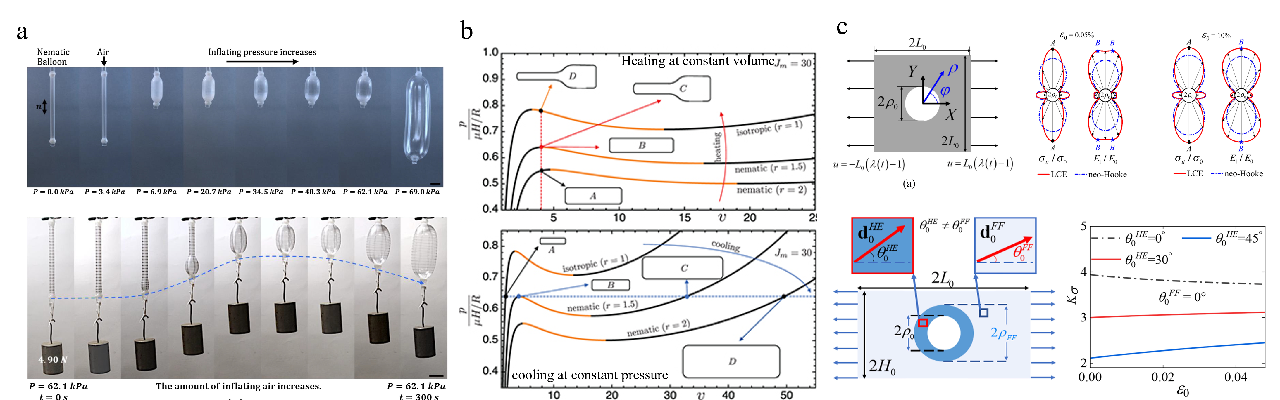 Figure 2(a) Inflation of a cylindrical balloon made of nematic LCEs[16]. (b) Gent pressure curve for an LCE ballon[17]. (c) Stress and strain concentration around the center hole in a LCEs sheet, and stress concentration with different initial director[20], [21].