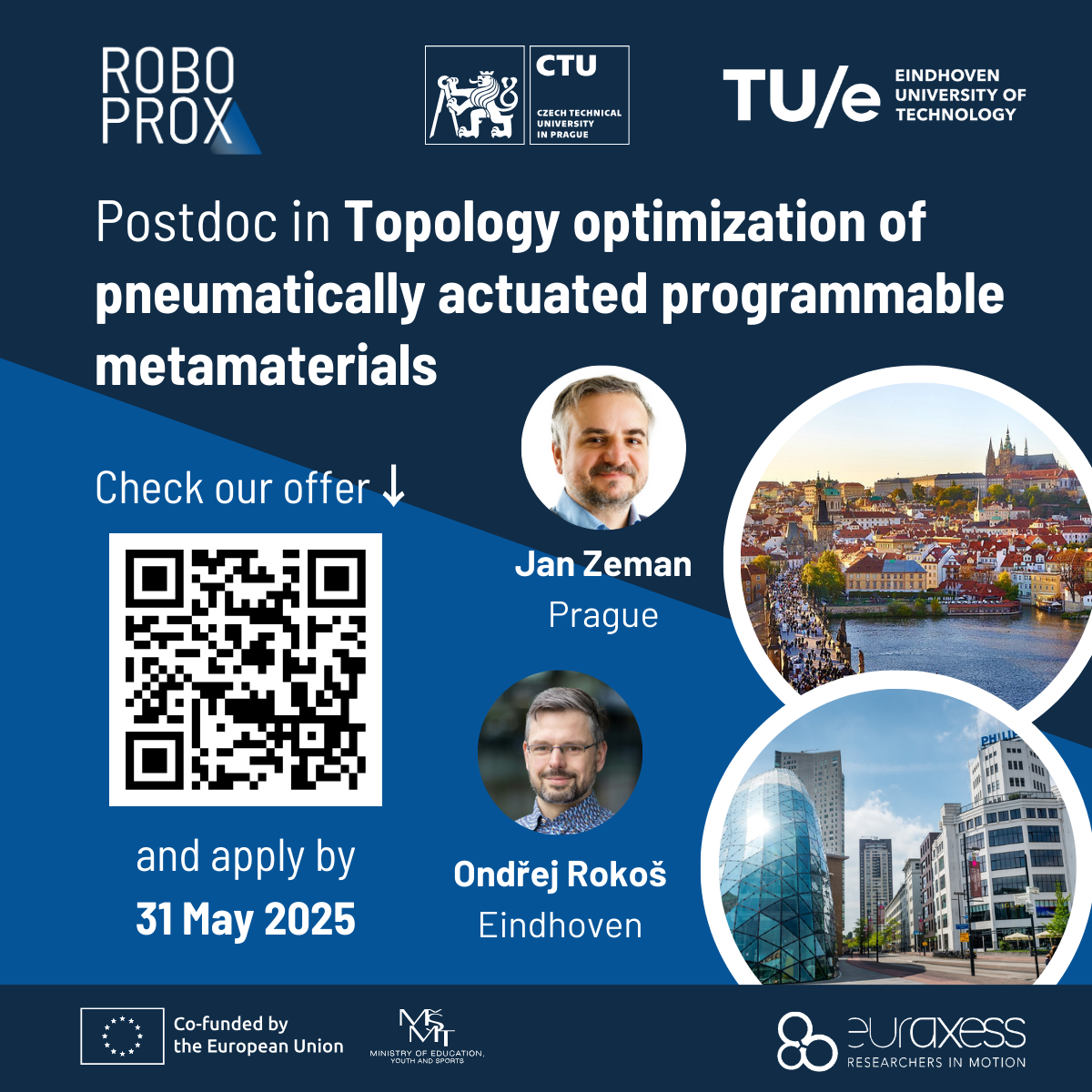 The Faculty of Civil Engineering at the Czech Technical University in Prague invites applications for a postdoctoral position in Topology optimization of pneumatically actuated programmable metamaterials for soft robotics applications. The position is jointly funded by the CTU Global Postdoctoral Fellowship and the interdisciplinary research project ROBOPROX, and will involve close collaboration with Group Rokoš at TU Eindhoven.