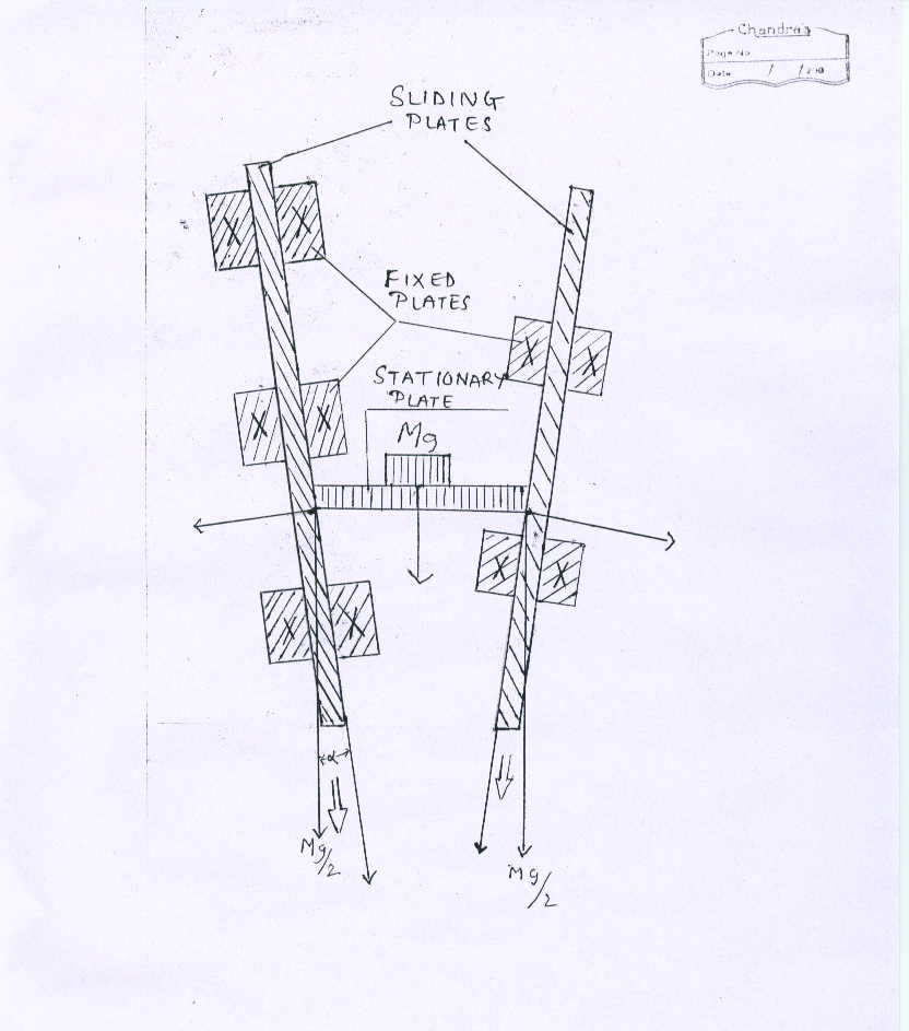 As shown in figure (energyefficiency1.jpg) sliding plates can slide over fixed plates. Stationary plate is simply supported horizontaly on sliding plates. Lubrication is provided at contact surfaces of stationary plate and sliding plates. Weight or load or force (mg) is applied at center of stationary plate. This load is equally devided and applied on each sliding plate in vertical downward direction (mg/2). This mg/2 cos(alpha) helps sliding plate to slide in nearly downward direction.